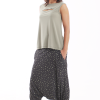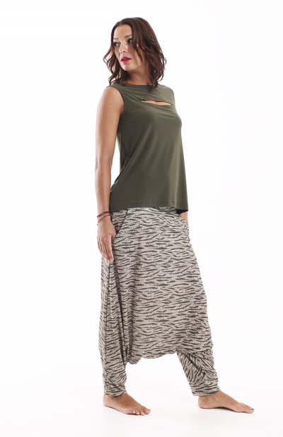 Pantalón tipo harem, con bolsillos oblicuos en los laterales y cinturilla elástica, súper cómoda sin cierres.