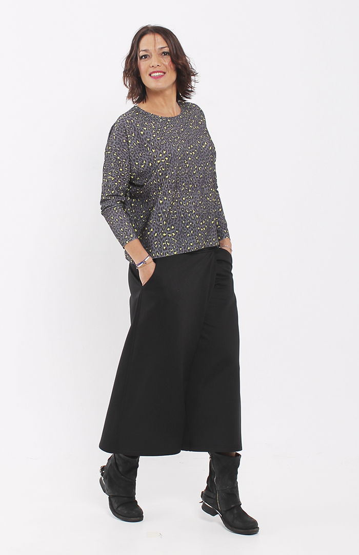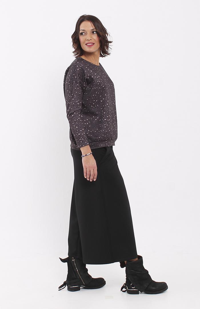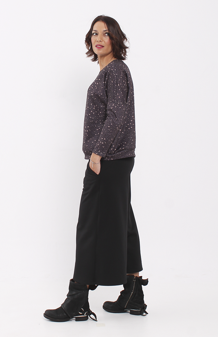 El corte es extremadamente amplio, con perneras tan anchas que crean una silueta casi de falda pantalón.