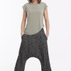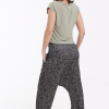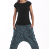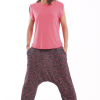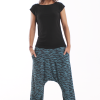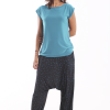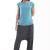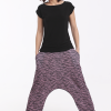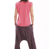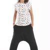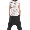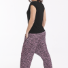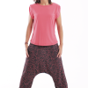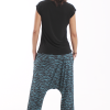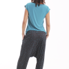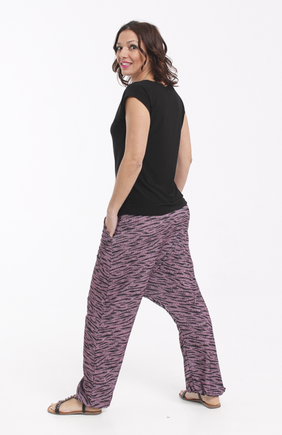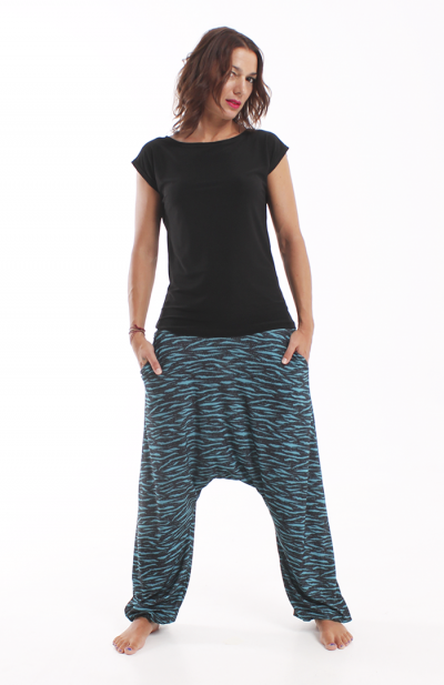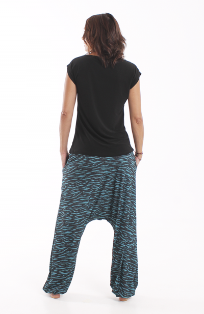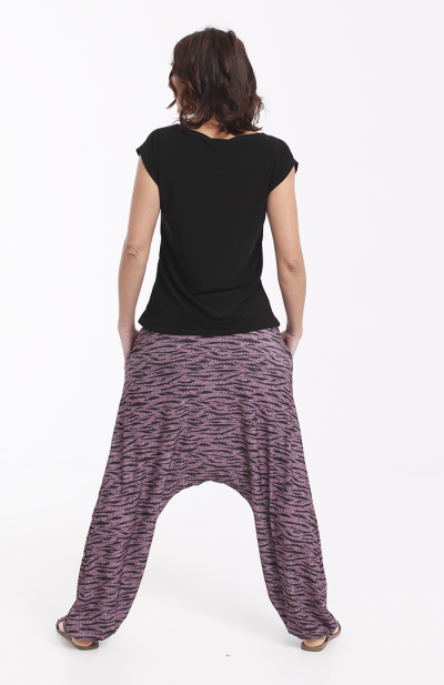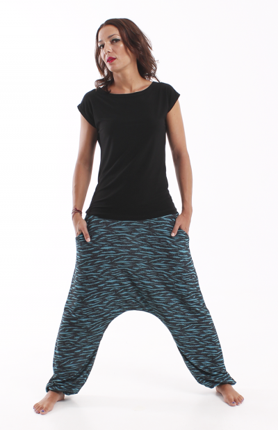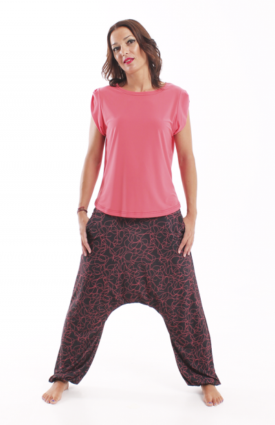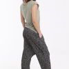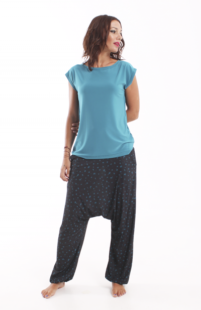 Los bajos del pantalón están recogidos con goma elástica y su cinturilla es de tejido muy elástico que hace que no necesite ningún tipo de cierre.