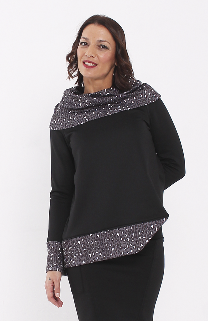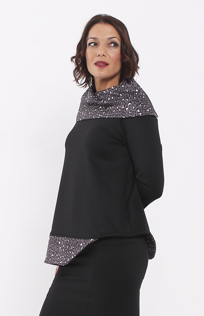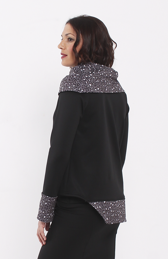 El bajo es asimétrico, muy original que combina con el tono del cuello y de los puños.