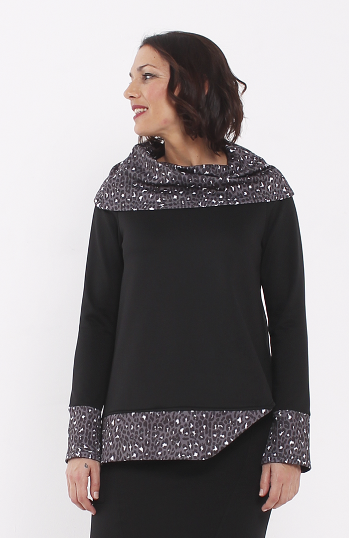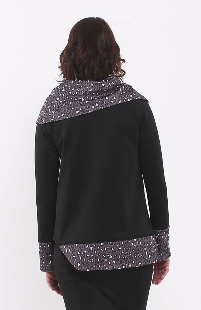 La sudadera tiene un cuello alto tipo “cowl” o cuello vuelto amplio.