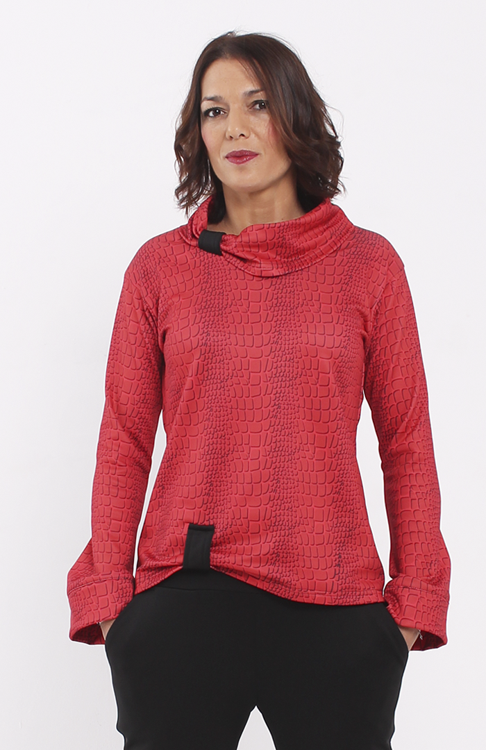 La sudadera tiene un cuello alto y holgado que se cierra con una pieza de tejido en un lateral.